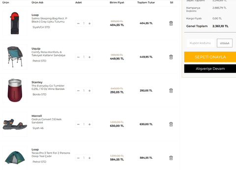 Ürünler arasında Stanley, Loap, Victorinox, Leatherman ve benzeri birçok kampçılık markası