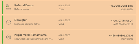 Nexo borsası referans programı kapsamında 25$ BTC ödülü veriyor. Buna ek olarak bana gelen 25$ dolar ödülün %68'ini yani 17$'ını size geri veriyorum, toplamda 42$ kazanmış oluyorsunuz. (Gelen ödül BTC'nin o günkü değerine bağlı azalıp artabilir) Tek yapmanız gereken borsaya referansımla üye olup gelişmiş KYC doğrulaması yapmak ve yatırdığınız 100$'ı borsada 1 ay bekletmek. Yatırım yaptıktan sonra birkaç saat içinde ödül kilitli şekilde hesabınıza düşüyor.