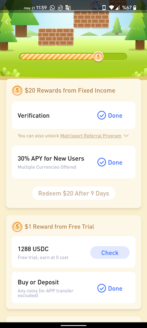 - Yatırım işlemi gerçekleştikten sonra uygulamadan "Welcome Rewards" bölümüne giriyoruz. Buradan "30% APY for New Users" yazan yere tıklayıp stake edeceğimiz varlığı seçiyoruz. Varlıklar kilitleniyor ve 8 gün sonra 20$+$2 ödül hesabımıza geliyor.