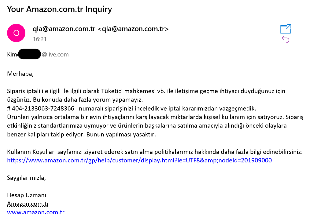 -Bu mesajdan cok umutlu degildim zaten burası türkiye sonucta güçsüzün ezildiği bir yer ertesi gun amazondan gelen cevap ise