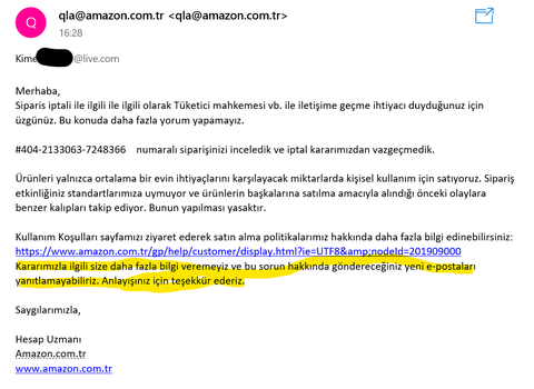 -Bu mesajdan cok umutlu degildim zaten burası türkiye, sonucta güçsüzün ezildiği bir yer ertesi gun amazondan gelen cevap ise