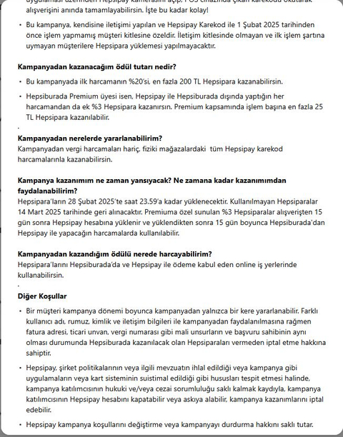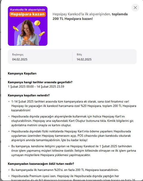 - 1-14 Şubat 2025 tarihleri arasında tüm kampanyalara ek olarak, sana özel fırsatımız var! Hepsipay ile yapacağın ilk karekod harcamana özel %20 Hepsipara, toplam 200 TL Hepsipara kazanabilirsin!