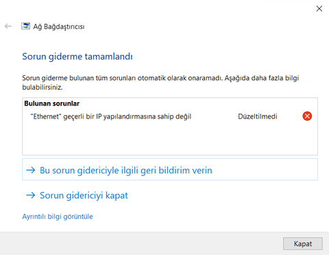 Ethernet geçerli bir IP yapılandırmasına sahip değil