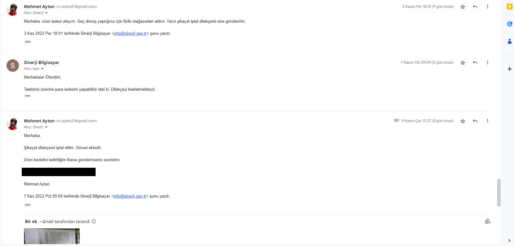 Bir süre sonra tüketici hakem heyetine şikayet ettim ve bir anda bana karşı tavları değişti. Hemen ürün iadesi/değişim yapacaklarını belirttiler. Şikayet dilekçemi iptal etmem karşılığında tabii. Ben kendilerine güvendim ve şikayet dilekçemi iptal ettim ve kendilerine ilettim. Bunu görsel olarak da ekliyorum buraya. Yalnız burada enterasan bir nokta var, tüketici hakem heyetine şikayet edip, daha sonra şikayetinizi iptal ederseniz o firma hakkında tekrar şikayette bulunamıyorsunuz. Ben bu firmanın güvenilir olmadığını bildiğim için şikayet iptal dilekçemi 1 ay sonra yürürlüğe koymalarını rica ettim. Şikayet dilekçemi iptal ettiğim dosyayı kendilerine gönderdim ve yaklaşık 1 hafta oldu hala sonuç yok. Maillere cevap vermiyorlar, telefonda sürekli geçiştiriyorlar.
