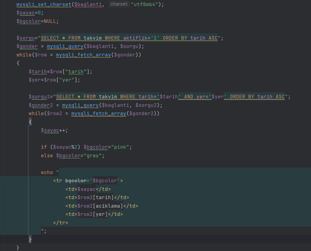 Bir mysql de etkinlikler adında bir tablom var ve burada yer, tarih, açıklama ve birim bilgilerini topluyorum. Tüm etkinlikleri süzme işlemini php ile yapabildim ancak aynı yerde ve aynı tarihte bulunan yani çakışma bulunan etkinlikleri sıralama kısmında takıldım bir sorgu hazırladım ama başaramadım. Yardımcı olabilecek var mıdır?
