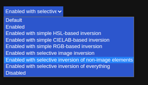 Şimdi seçeneklere bakalım, buradan istediğinizi seçebilirsiniz, benim gözüme en uygun olan seçenek, "Enabled with selective inversion of non-image elements" seçeneğiydi, siz de deneyerek kendinize en uygun olanı bulabilirsiniz.