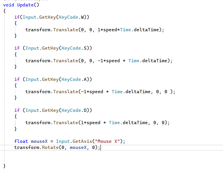 float horizontalInput = Input.GetAxis("Horizontal"); transform.Rotate(0, horizontalInput * Time.deltaTime * horizontalspeed, 0); float verticalInput = Input.GetAxis("Vertical"); transform.Translate(0, 0, verticalInput* Time.deltaTime*speed);Kod