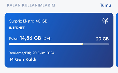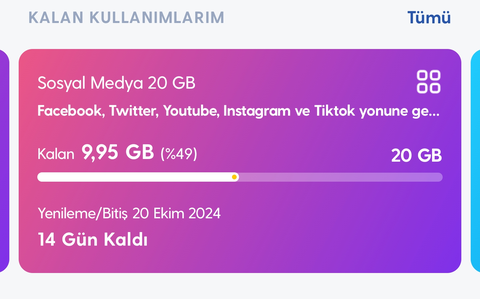 Arkadaşlar ben ilk defa turkcell kullanıyorum. Yeni geçiş yaptım. Kullandığım tarife 20+20 Youtube Facebook Tiktok tarifesi sadece bu platformlara giriyorum başka bir yere giriş yapmıyorum ama nedense ana paket bitiyor ana paket 1,5gb kaldı daha 20 gün var. Sosyal medya paketinden de 9gb kaldı bu nasıl olur.
