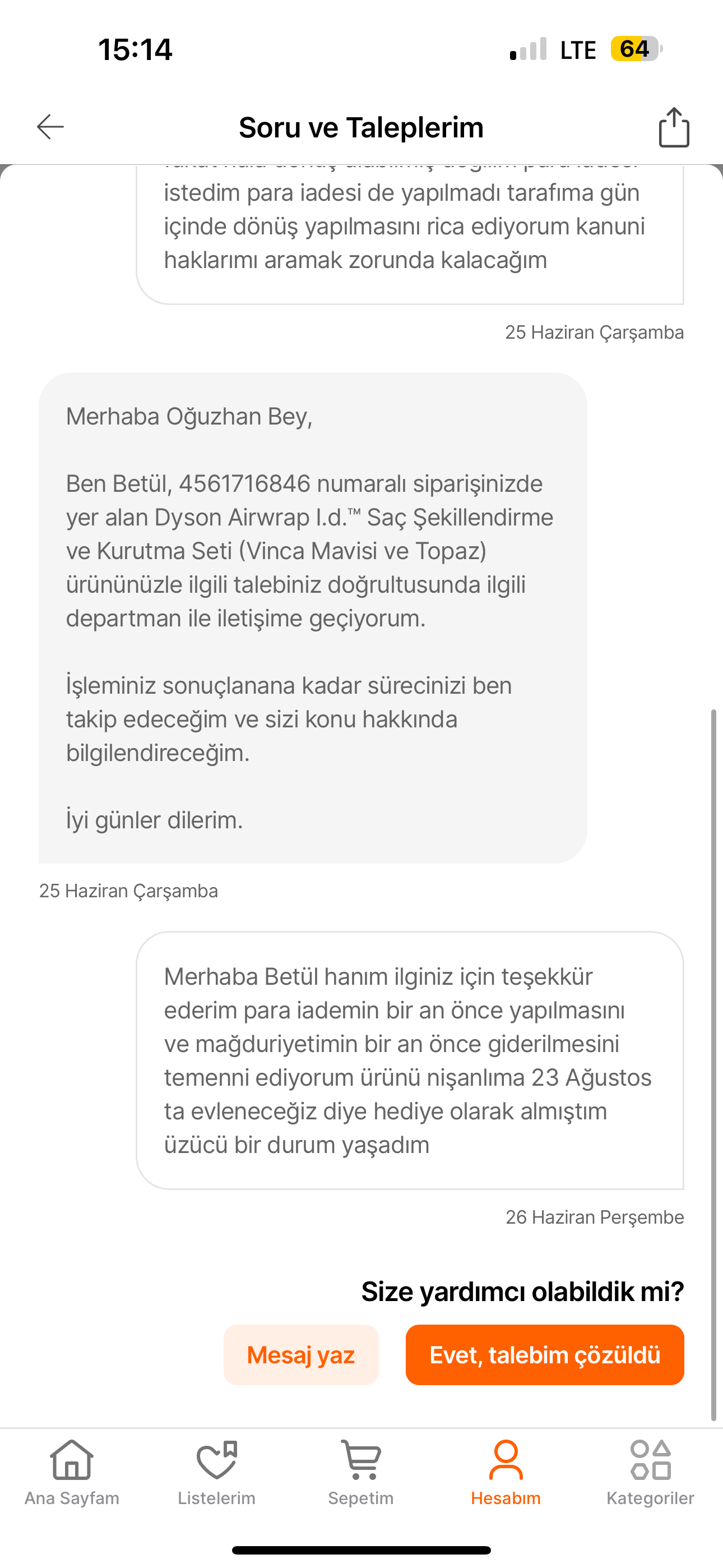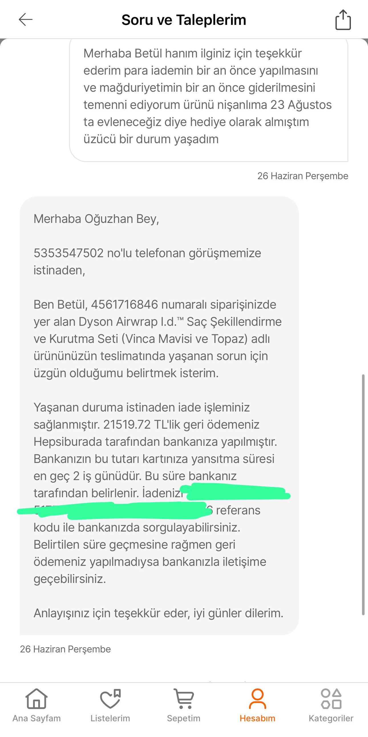 Hepsiburada gibi büyük bir firma nasıl olur da bünyesinde böyle satıcıları barındırabilir? 23 Ağustos'ta düğünüm var, nişanlıma hediye almıştım. Mağduriyetimin giderilmesini istiyorum.