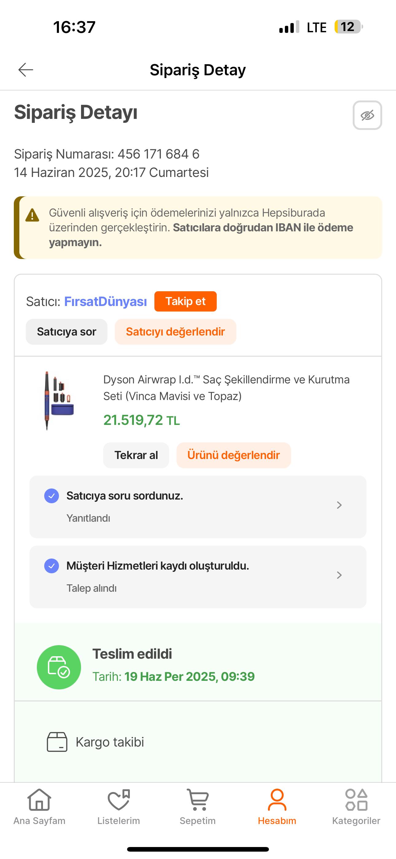 14.06.2025 günü Hepsiburada'dan Fırsatdünyası adlı satıcıdan, 4561716846 sipariş numarası ile Dyson Airwrap™ Saç Şekillendirme ve Kurutma Seti (Vinca Mavisi ve Topaz) ürününü satın aldım. Evde amcam bulunduğu için kargoyu amcamın adına sipariş ettim. Satıcı, ürünü Kolay Gelsin firması ile göndermiş. Kargocu zile basmış, 'kargo var' deyip yukarı çıkmadan, teslim kodu istemeden kargoyu kapıya bırakıp gitmiş. Sonrasında ise boş kargo poşetiyle karşılaştık ve sistemde ürün teslim edilmiş olarak görünüyordu. 19.06.2025 tarihinde hemen Hepsiburada'yı aradım, talep açtılar. Kontrol ettiklerinde satıcının kayıtlı adresinin İstanbul olduğunu, ancak kargonun gönderildiği adresin Mardin Nusaybin olduğunu gördüler. Poşeti ve barkodu çektim, kargonun ağırlığı sistemde zaten 1 desi olarak gözükmekteydi. Koca kutusu olan bir ürün nasıl 1 desi olabilir? Artık satıcıya kesinlikle güvenmediğimi belirttim ve ürünün para iadesini istiyorum. Satıcı 'tekrar göndereceğim' dese de ben iade talebimi ilettim. 3 iş gününde çözülecek dediler. Bugün 25.06.2025, 4. iş günündeyiz ve hâlâ bana dönüş yapan yok.