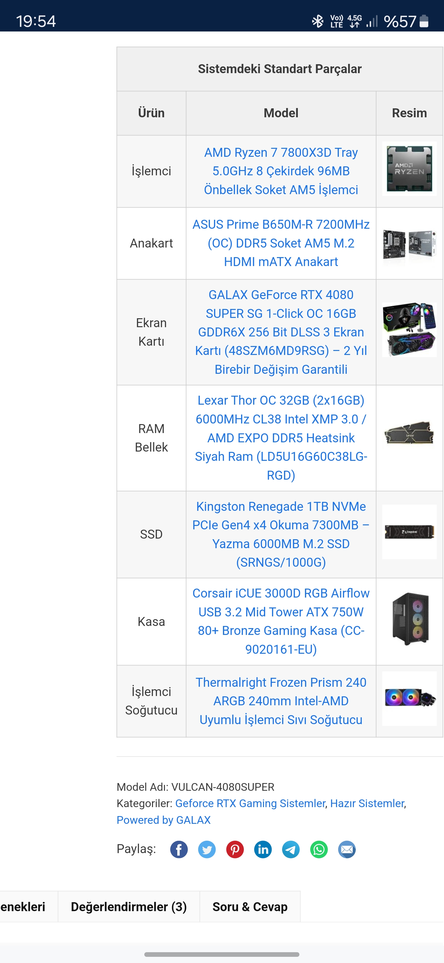 Amd ryzen 7800x3d Galax nividia rtx 4080 süper Lexar rgb 6400 mhz 32 gb 16+16 Asus tuf gaming b650m-e wifi Asus tuf gaming LCI 2 240 mm Corsair iCUE 3000D airflow rgb |