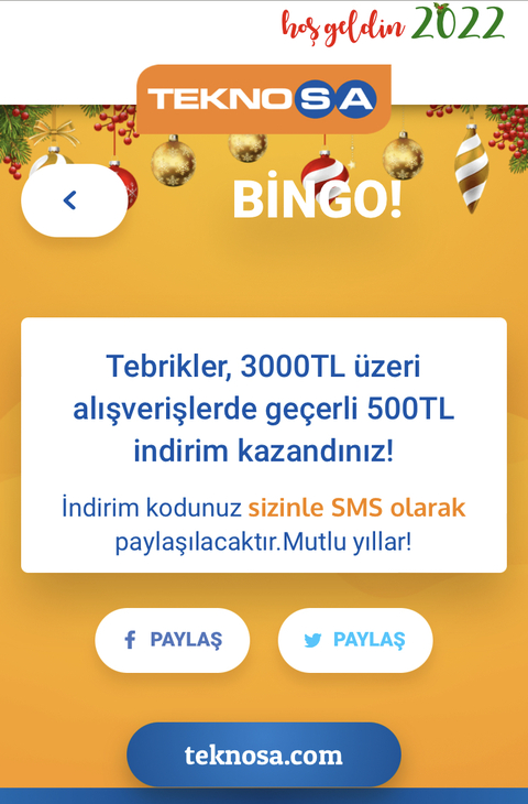 Teknosa bingo hediye çeki (3000/250-3000/500)