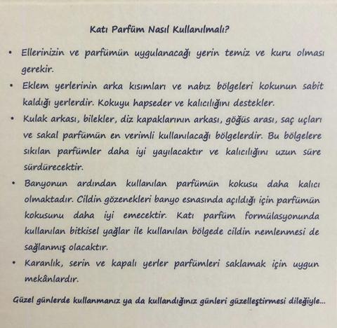 Kalıcılığı artıran özel formülasyon ile alkollü parfümleri kullanamayan,alerjisi olan ya da ekstra kalıcılık isteyen bireyler için üretilmiştir. Aynı zamanda besleyici ve nemlendirici özelliği ile teninize bakım yapmış olacaktır. Bilekler, kollar, bacaklar, eklem bölgeleri, kulak arkası, kuru saç ve sakal uçları katı parfüm için en etkili bölgelerdir. Güzel günlerde kullanmanız ya da kullandığınız günleri güzelleştirmesi dileğiyle.