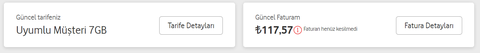 22.11.2022 10:41 itibariyle guncel fatura tutariniz vergiler dahil 100.00 TL'ye ulasmistir. Bu bilgilendirmeyle kullaniminiz kisitlanmaz, kullanimlariniza bagli olarak ucretlendirmeniz devam eder. Yurtdisinda anlasmasi olmayan operatorler uzerinden yapilan kullanimlar, ayrintili fatura ucreti ve faturalama sonrasi indirimler bu bilgilendirmeye dahil olmayabilir. Detaylar icin B003