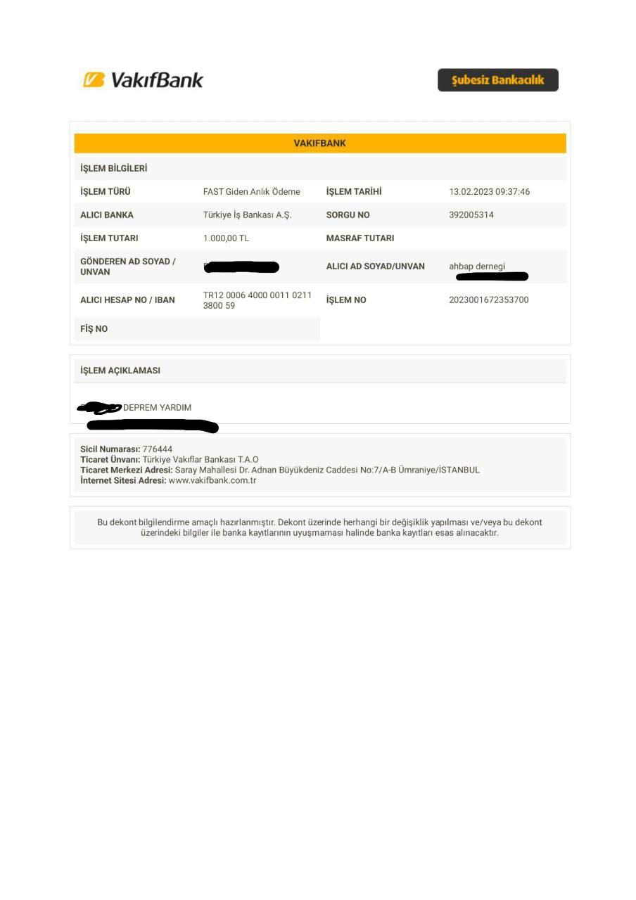 Bu arada arkadaşlar herhangi birinin hesabına değil doğrudan ahbap derneğine para gönderiyorsunuz.