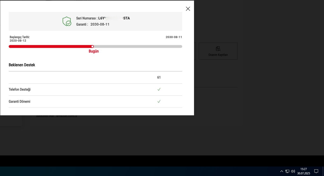 Garanti: 10 YIL (+5 yıl Devam ediyor, 11.08.2030 a kadar). Garanti Durumunu gösterir ekran görüntüsünü fotoğrafların en sonuna ekledim!