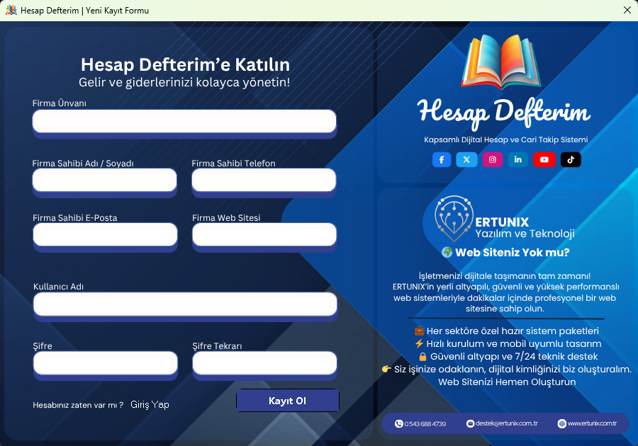🌟 HESAP DEFTERİM – Ücretsiz, Güvenli ve Modern Veresiye Takip Uygulaması İşletmesini dijitale taşımak isteyen esnaf ve küçük işletmeler için özel olarak geliştirdiğim Hesap Defterim, basitliği ve hızıyla öne çıkan tamamen ücretsiz bir veresiye takip yazılımıdır. Her seviyeden kullanıcı için kolay anlaşılır bir arayüze sahip olması, uygulamayı alanında benzersiz kılıyor. 📥 İndirmek ve Denemek İsteyenler İndiren herkes direkt kullanabilir — kurulum, lisans veya demo gerektirmez. 📩 İletişim Her türlü soru, geliştirme önerisi veya geri bildirim için özel mesajdan ulaşabilirsiniz. ERTUNIX Yazılım ve Teknoloji Sadece Kod Değil, Çözüm Üretiyoruz. www.ertunix.com.tr www.hesapdefterim.com destek@ertunix.com.tr +905436884739 |