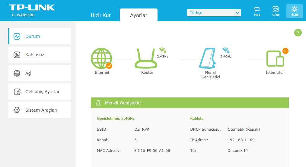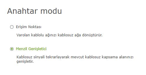 2 çalışma modu vardır (8. Fotoğrafa bakınız) ,Erişim noktası (A.P.) ve Menzil genişletici (Modeme kablosuz bağlanarak ,aktarma ).