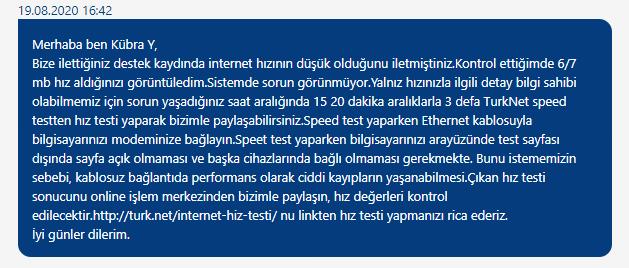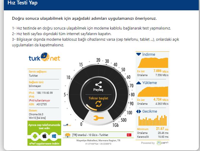 Ben türknetten ayrılınca ilk Millenicom aldım. Berbat ötesi dolandırıldım. Onun konusu ayrı. Dönen oyunları geç anladım. yarım saat kullanıp iptal ettirdim. Şimdi Ttnetten 35 Mbit alıyorum evde bana yetiyor. Zaten evimde 2 internet var. 35 birisi 50-60 da diğeri derken 100 leri görüyorm. Hatta zaman zaman 110 lara çıktığımda oluyor. Ama gel gelelim bu kadar hız bana lazım değil. Stabil hız lazım. Eşim öğretmen EBA dan ders veriyor diye eve 2 tane internet bağlattım bu sorunlu süreçte. Birisi giderse diğeri kalsın diye. |