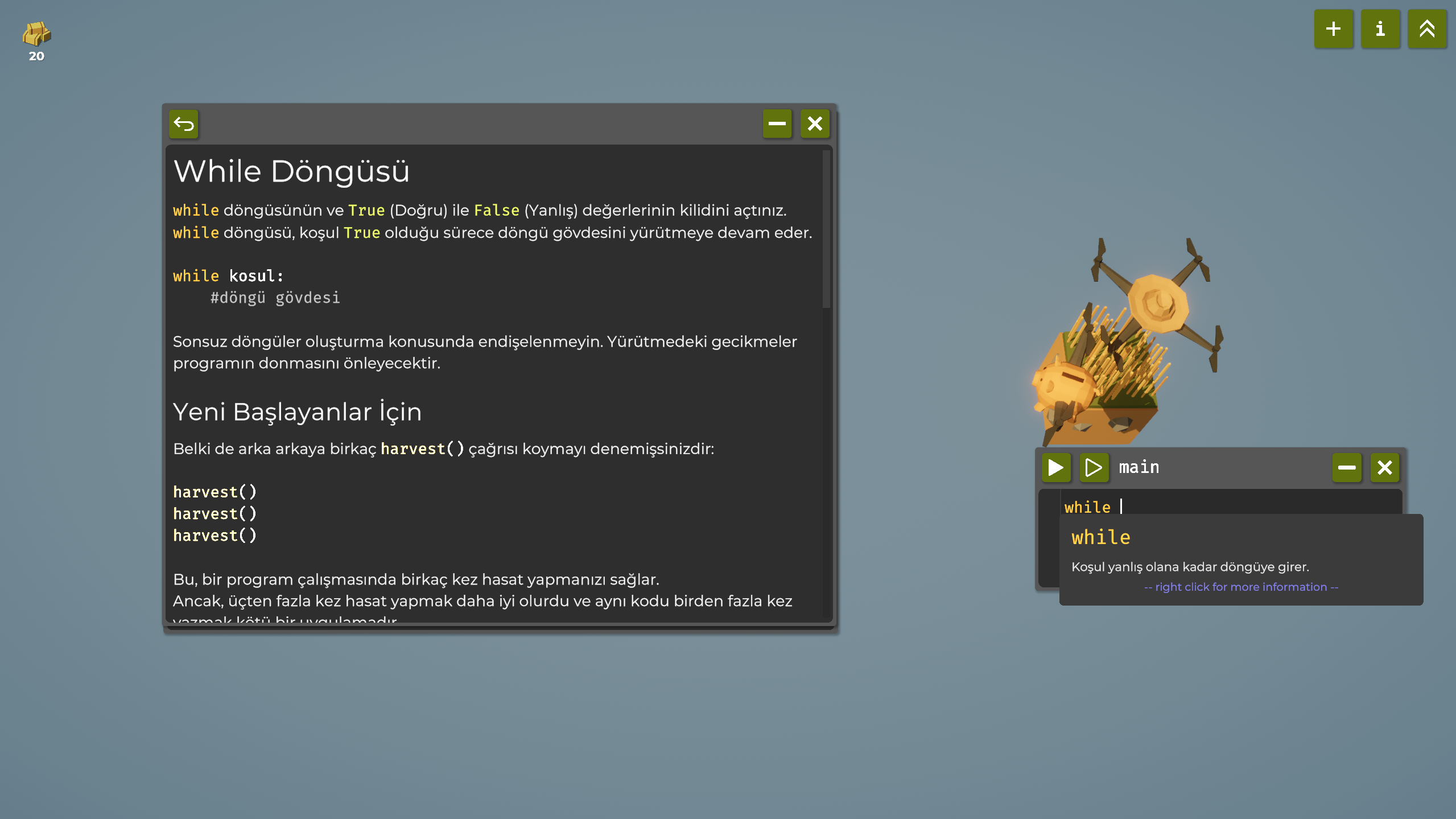 The Farmer Was Replaced %100 Türkçe Yama Çalışması Merhaba arkadaşlar, Programlama ve tarım mekaniklerini birleştiren, son zamanların en özgün oyunlarından biri olan The Farmer Was Replaced için hazırladığım Türkçe yamayı sizlerle paylaşıyorum. Oyunun teknik terimleri ve yönlendirmeleri, kodlama mantığını kavramak adına tamamen Türkçeleştirilmiştir. Yama Detayları